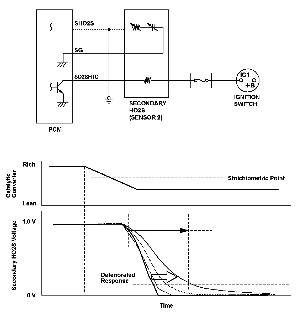 If the response time of the secondary HO2S becomes longer than the specified time after current to the secondary HO2S heater is applied, a malfunction is detected and a DTC is stored.
