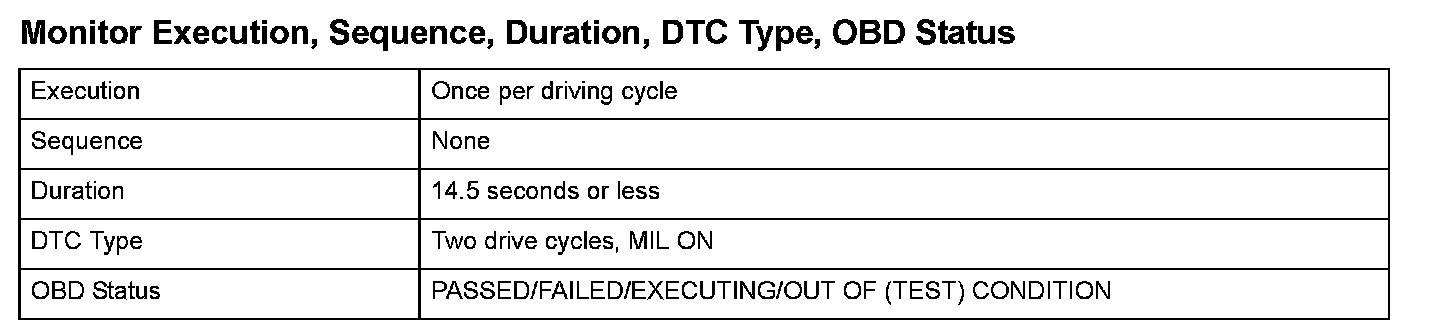 Monitor Execution, Sequence, Duration, DTC Type, OBD Status