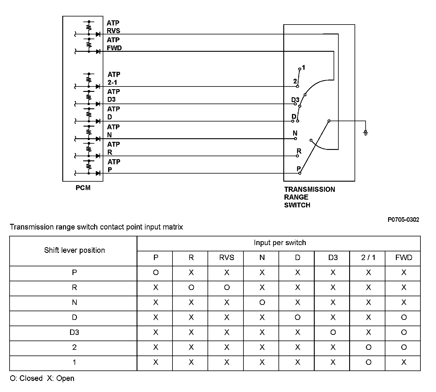 The transmission range switch is attached to the control shaft. Operating the shift lever makes the control shaft rotate via the shift cable. The A/T gear position indicator indicates which position is selected according to the Low/High signal combinations which vary based on the control shaft rotational angle. The control shaft changes the position of the transmission range switch, activates the manual valve, and switches hydraulic pressure to shift the transmission through forward/neutral/reverse. The transmission range switch signal is used to determine the shift schedule. The voltage is 12 V (High) at the powertrain control module (PCM) input terminal when each transmission range switch position is open, and it is 0 V (Low) when each switch is closed. If the FWD switch stays open while the vehicle repeatedly accelerates to a specified vehicle speed and then stops despite being in the D position, the PCM detects a malfunction in the transmission range switch (open) and stores a DTC.