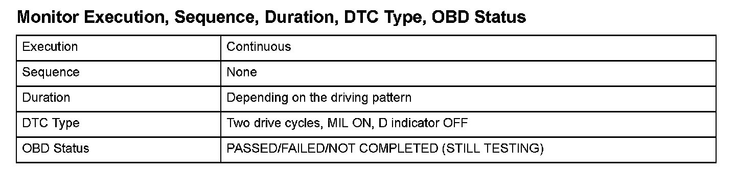 Monitor Execution, Sequence, Duration, DTC Type, OBD Status