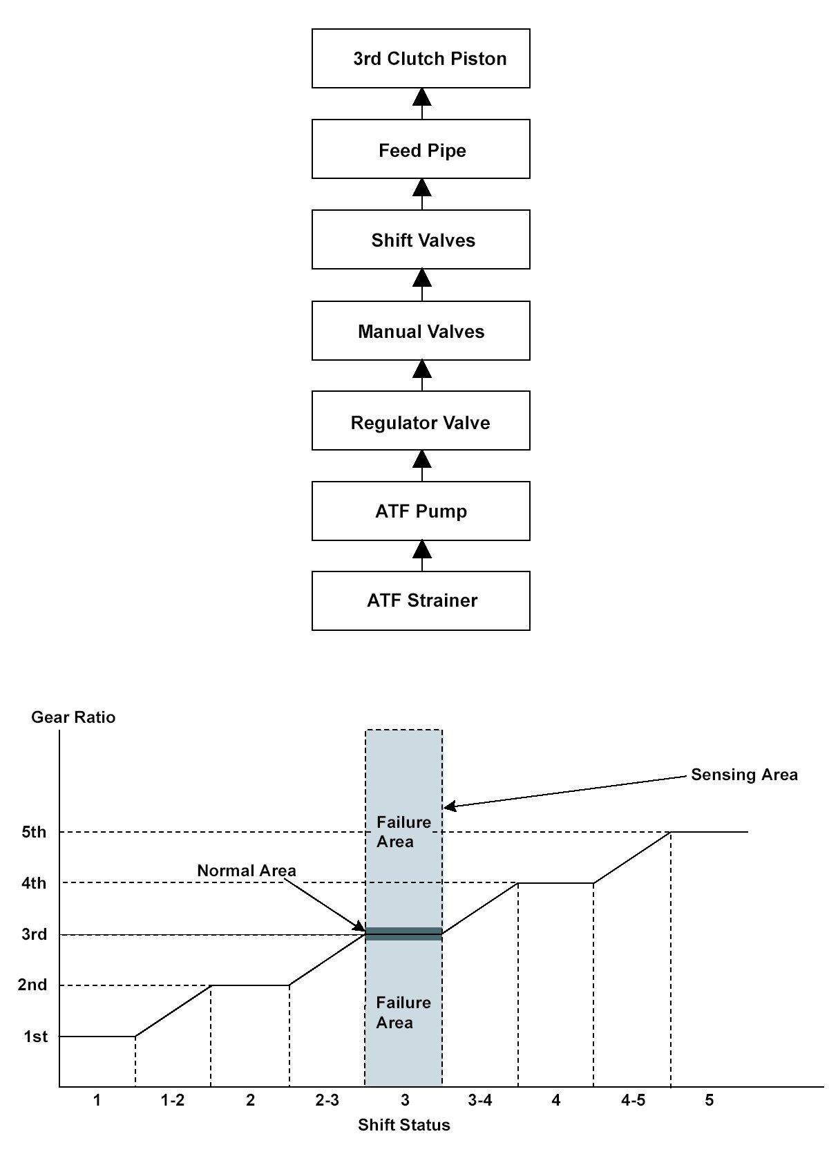 To engage 3rd gear, line pressure is supplied to the 3rd clutch piston, the 3rd clutch is engaged, and the output shaft (countershaft) and the output shaft (countershaft) 3rd gear are connected and revolve together. Hydraulic pressure is supplied to the 3rd clutch through the ATF strainer --> the ATF pump --> the regulator valve --> the manual valve --> the shift valves --> the feed pipe --> the 3rd clutch piston. (A shift valve failure in the supply route above is detected by the malfunction detection of each shift solenoid valve.) The powertrain control module (PCM) computes the ratio of the input shaft (mainshaft) speed to the output shaft (countershaft) speed.