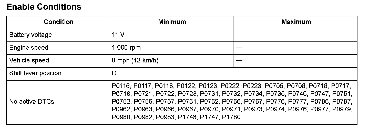 Start the engine, shift to D, and drive the vehicle at a speed of 8 mph (12 km/h) or more for at least 12 seconds in 3rd gear.