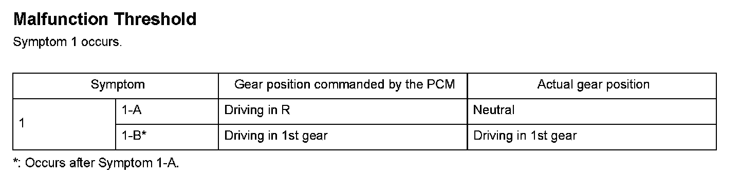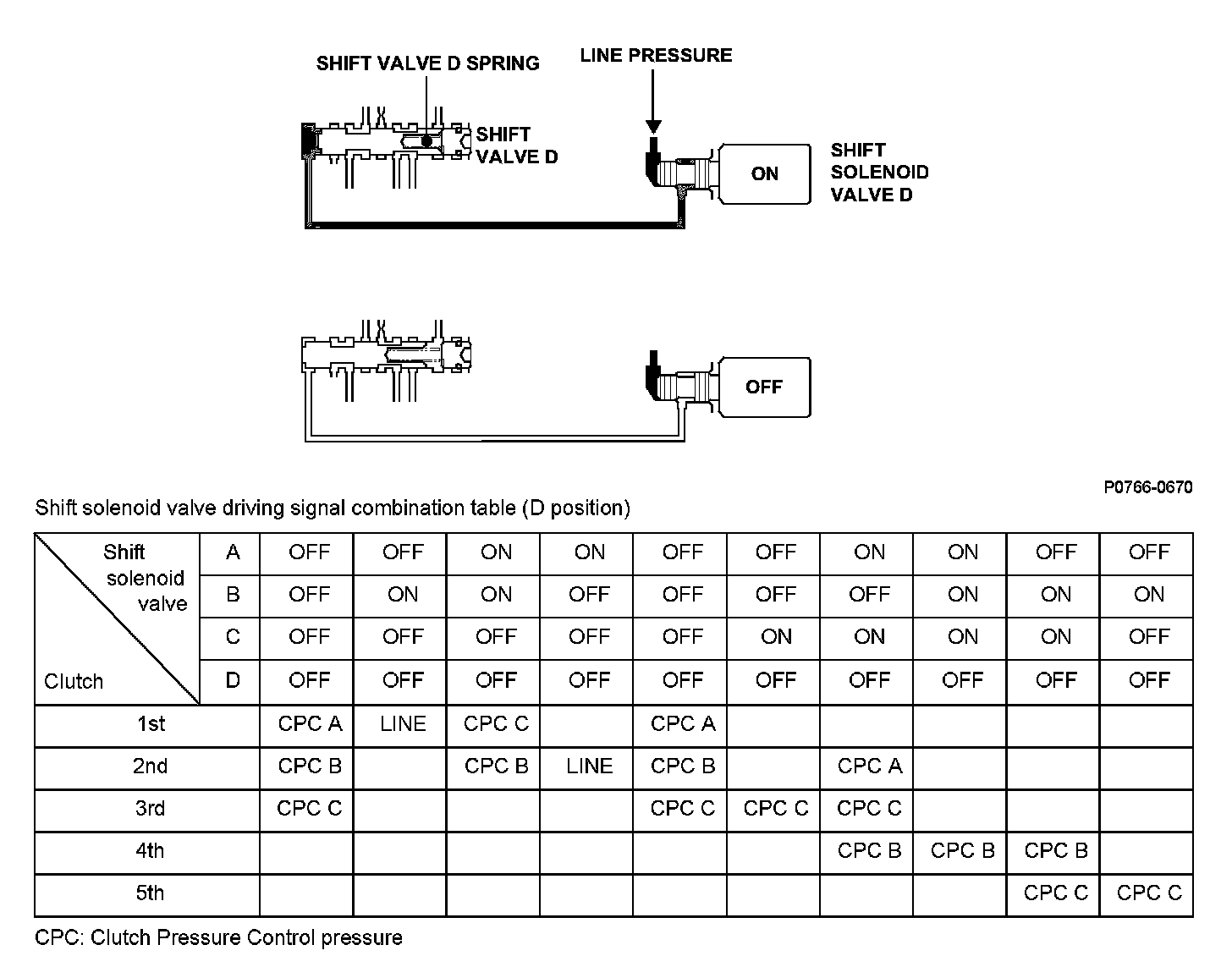 Shift solenoid valve D is installed in the transmission housing. It is controlled by the ON/OFF signal from the powertrain control module (PCM) to apply line pressure to shift valve D. The signal from the PCM is output to apply clutch pressure control pressure to the proper gear change clutch according to the gear change schedule. When the signal to shift solenoid valve D from the PCM is ON, and line pressure is applied to shift valve D, it operates against the shift valve D spring. When the signal to shift solenoid valve D from the PCM is OFF, and line pressure is discharged, shift valve D is inactive. The PCM monitors the input shaft (mainshaft) speed and the output shaft (countershaft) speed at the gear change determined by the shift schedule. When an improper gear ratio is output compared to the predetermined gear change mode, a shift solenoid valve D OFF failure is detected and a DTC is stored.