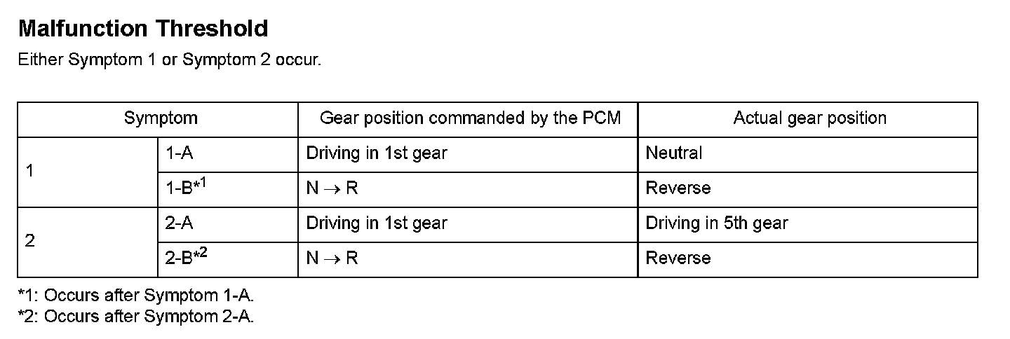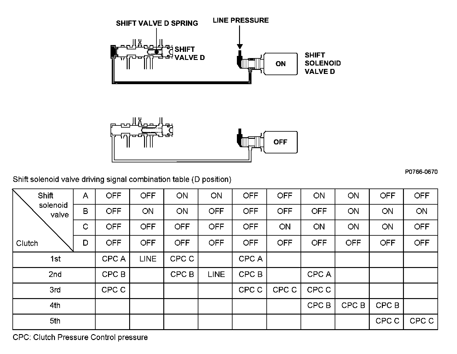 Shift solenoid valve D is installed in the transmission housing. It is controlled by the ON/OFF signal from the powertrain control module (PCM) to apply line pressure to shift valve D. The signal from the PCM is output to apply clutch pressure control pressure to the proper gear change clutch according to the gear change schedule. When the signal to shift solenoid valve D from the PCM is ON, and line pressure is applied to shift valve D, it operates against the shift valve D spring. When the signal to shift solenoid valve D from the PCM is OFF, and line pressure is discharged, shift valve D is inactive. The PCM monitors the input shaft (mainshaft) speed and the output shaft (countershaft) speed at the gear change determined by the shift schedule. When an improper gear ratio is output compared to the predetermined gear change mode, a shift solenoid valve D ON failure is detected and a DTC is stored.