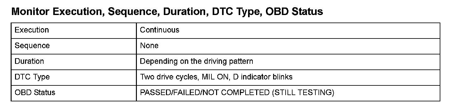 Monitor Execution, Sequence, Duration, DTC Type, OBD Status