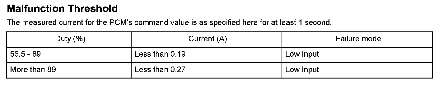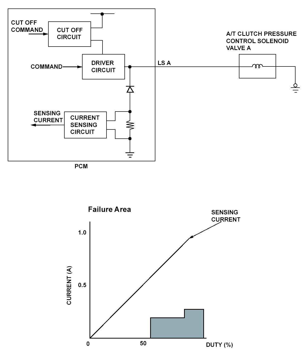 A/T clutch pressure control solenoid valve A is used for clutch pressure control and lock-up control. A spool in A/T clutch pressure control solenoid valve A pushes a valve according to the duty cycle that is controlled by the powertrain control module (PCM) to pressurize fluid so the hydraulic pressure is proportional to the current. The PCM measures the current flowing through A/T clutch pressure control solenoid valve A and uses feedback control to compensate for the difference between the actual current and the commanded one. If the measured current for the PCM output duty cycle is not within a specified range (open or short), a malfunction is detected and a DTC is stored.