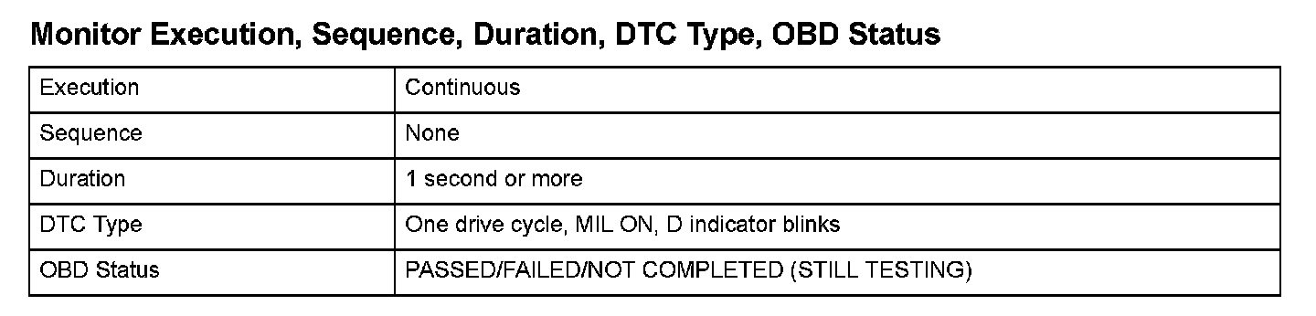 Monitor Execution, Sequence, Duration, DTC Type, OBD Status