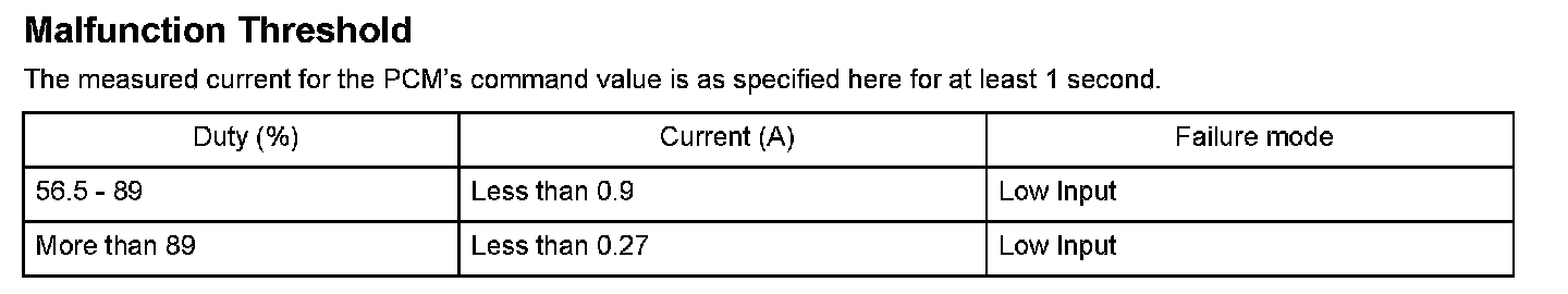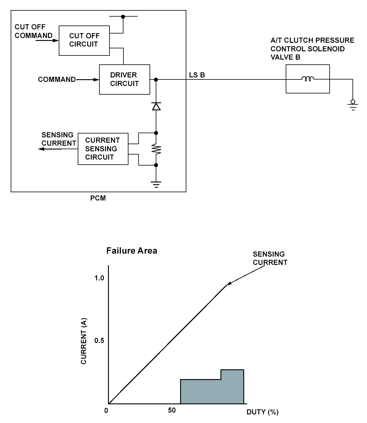 A/T clutch pressure control solenoid valve B is used for clutch pressure control. A spool in A/T clutch pressure control solenoid valve B pushes a valve according to the duty cycle that is controlled by the powertrain control module (PCM) so the hydraulic pressure is proportional to the current. The PCM measures the current flowing through A/T clutch pressure control solenoid valve B and uses feedback control to compensate for the difference between the actual current and the commanded one. If the measured current for the PCM output duty cycle is not within a specified range (open or short), a malfunction is detected and a DTC is stored.