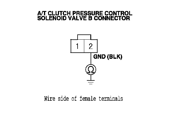10. Measure the resistance between A/T clutch pressure control solenoid valve B connector terminals No. 1 and No. 2.