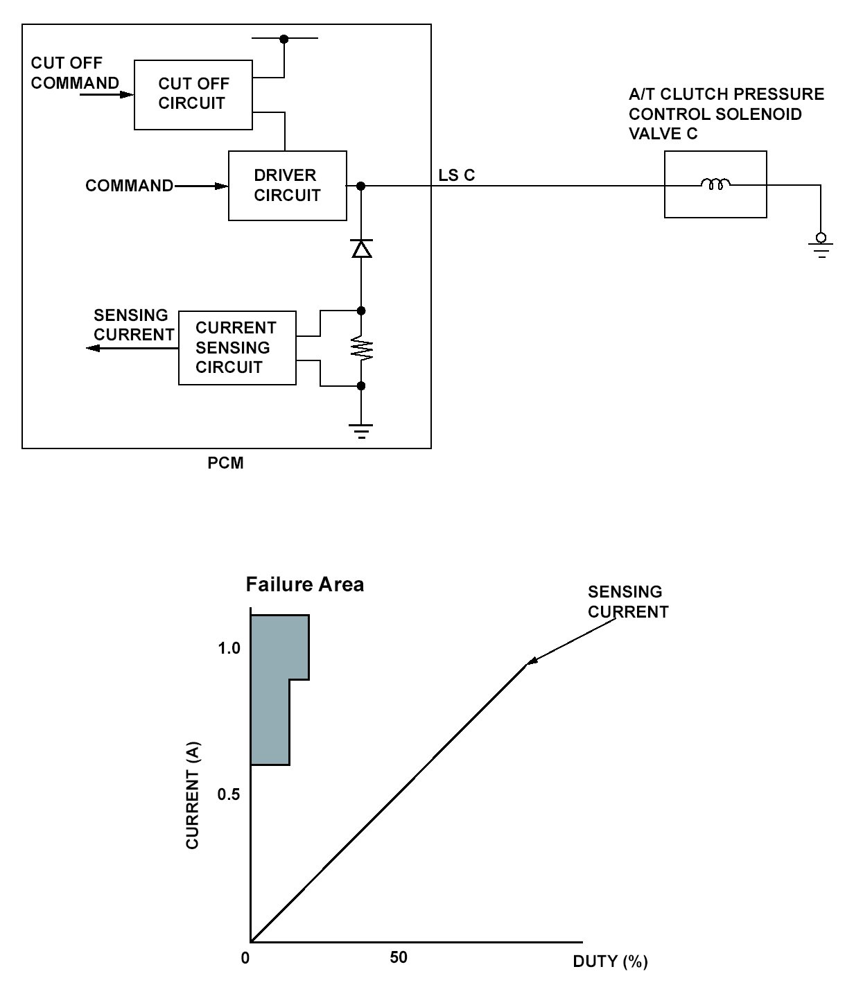 A/T clutch pressure control solenoid valve C is used for clutch pressure control. A spool in A/T clutch pressure control solenoid valve C pushes a valve according to the duty cycle that is controlled by the powertrain control module (PCM) to pressurize fluid so the hydraulic pressure is proportional to the current. The PCM measures the current flowing through A/T clutch pressure control solenoid valve C and uses feedback control to compensate for the difference between the actual current and the commanded one. If the measured current for the PCM output duty cycle is not within a specified range (open or short), a malfunction is detected and a DTC is stored.