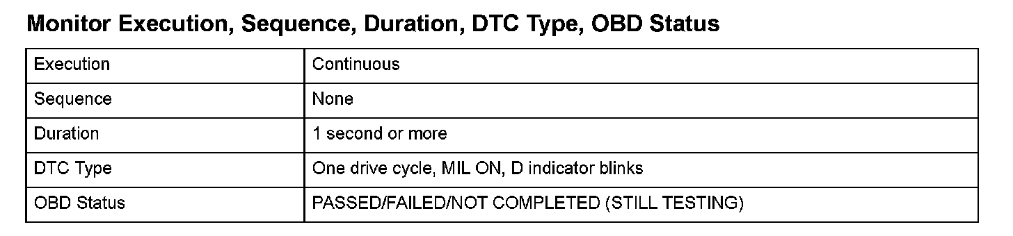 Monitor Execution, Sequence, Duration, DTC Type, OBD Status