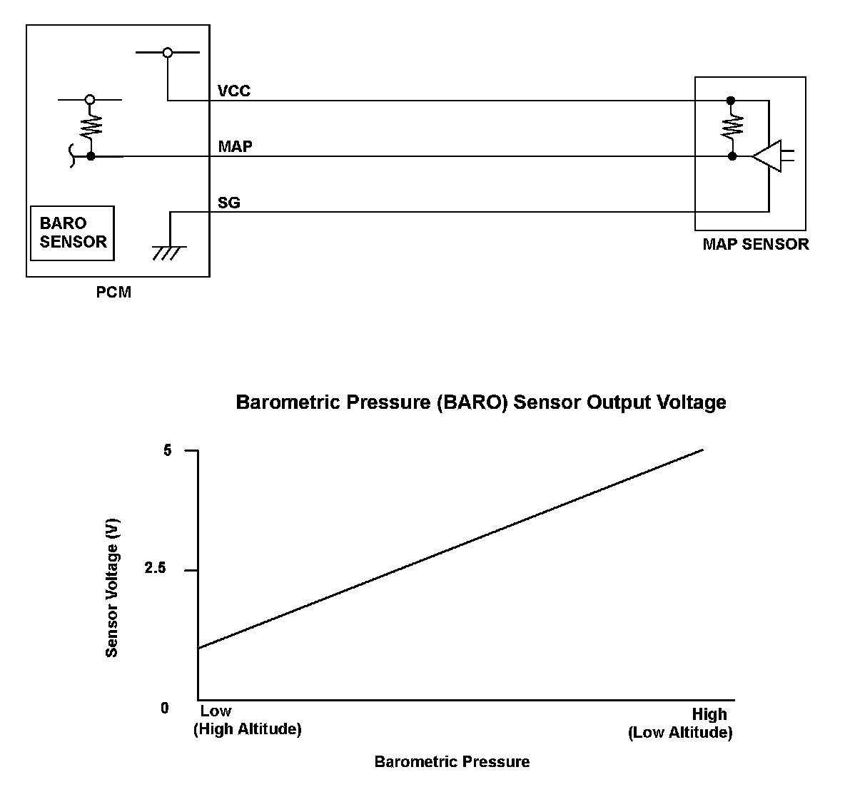 The barometric pressure (BARO) sensor is built into the powertrain control module (PCM) and monitors atmospheric pressure. The PCM estimates appropriate intake airflow from the manifold absolute pressure (MAP) sensor output voltage and BARO sensor output voltage. When BARO sensor output voltage is within the specified range, a malfunction is detected and a DTC is stored.