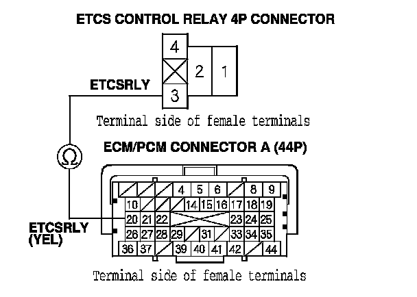 14. Check for continuity between ETCS control relay 4P connector terminal No. 2 and ECM/PCM connector terminal C1.