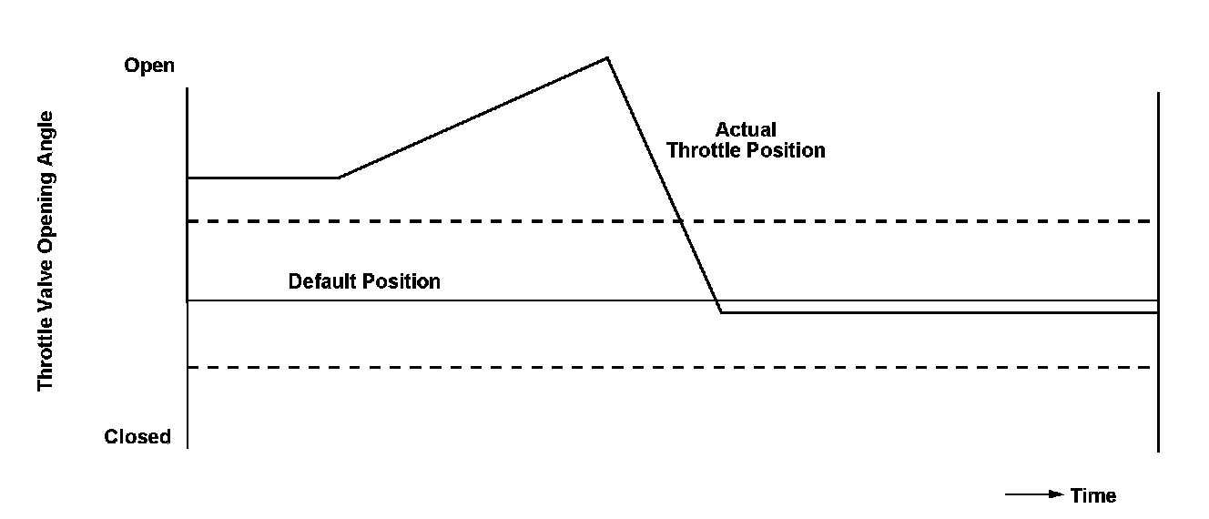 The electronic throttle control system (ETCS) controls the throttle valve opening. The system includes the throttle actuator, the throttle valve, throttle position (TP) sensors A and B, the throttle actuator control module, the throttle actuator control module relay, the accelerator pedal position (APP) sensor, and the powertrain control module (PCM). The throttle valve return spring is attached to the throttle valve gear to return the throttle valve to the default position. If the throttle valve does not return to the default position when the throttle actuator control module moves the throttle actuator to the default position from the middle position, a malfunction is detected and transmitted to the PCM. When the PCM receives the malfunction data from the throttle actuator control module, the PCM detects a malfunction of the throttle valve return spring and a DTC is stored.