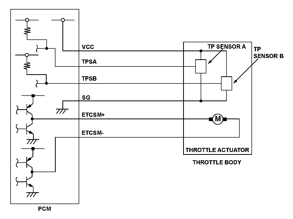 The electronic throttle control system (ETCS) controls the throttle valve opening. The system includes the throttle actuator, the throttle valve, throttle position (TP) sensors A and B, the throttle actuator control module, the throttle actuator control module relay, the accelerator pedal position (APP) sensor, and the powertrain control module (PCM). When the accelerator pedal is pressed, the APP sensor detects the accelerator opening value. The accelerator pedal opening value is converted to a signal in the APP sensor and transmitted to the PCM to compute the target position. The target position signal is then transmitted to the throttle actuator control module. The throttle actuator control module then operates the throttle actuator to move the throttle valve to the target position. The actual throttle valve position is determined by TP sensor A (installed in the throttle body). When the output current to the throttle actuator exceeds the specification for a set time, the throttle actuator control module detects a malfunction and transmits the malfunction data to the PCM. When the PCM receives the malfunction data, it detects a malfunction of the throttle actuator system and stores a DTC.