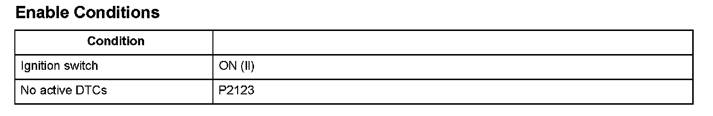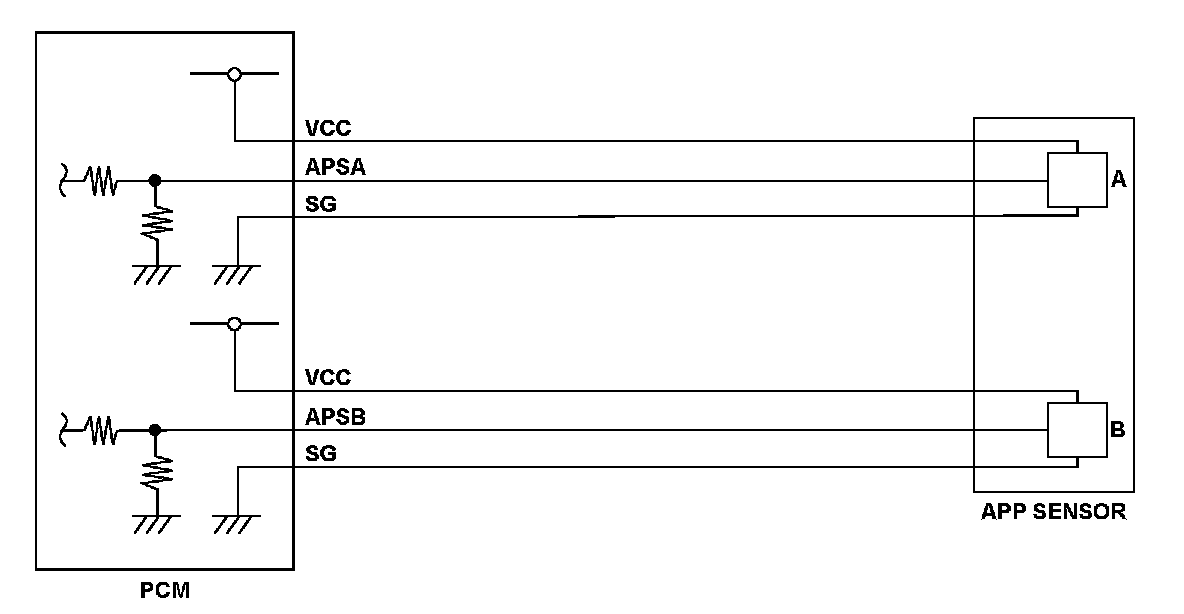 Accelerator pedal position (APP) sensor A is a part of the electronic throttle control system (ETCS). It is used to convert the position of the accelerator pedal into electrical signals. Based on these signals, the powertrain control module (PCM) controls the throttle actuator so that the throttle position agrees with the accelerator pedal position. If the signal voltage from APP sensor A is a set value or less, the PCM detects a malfunction and stores a DTC.