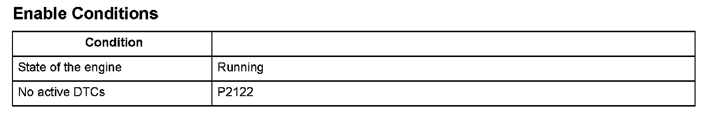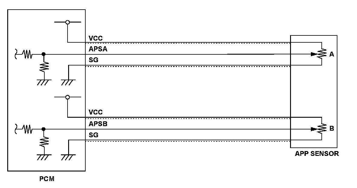 Accelerator pedal position (APP) sensor A is a part of the electronic throttle control system (ETCS), and it is used to convert the position of the accelerator pedal into electrical signals. Based on these signals, the powertrain control module (PCM) controls the throttle actuator so that the throttle position agrees with the accelerator pedal position. If the signal voltage from APP sensor A is a set value or more, the PCM detects a malfunction and stores a DTC.