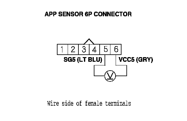 6. Measure the voltage between APP sensor 6P connector terminals No. 5 and No. 6.