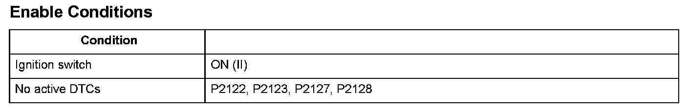 Accelerator pedal position (APP) sensor A and accelerator pedal position (APP) sensor B are potentiometers. They are installed on the accelerator pedal. When the accelerator pedal is pressed, the APP sensors A and B detect the accelerator opening value. The accelerator pedal opening value is converted to a signal in APP sensors A and B and transmitted to the powertrain control module (PCM) to compute the target position. The target position signal is then transmitted to the throttle actuator control module. APP sensor A is for the primary control, and APP sensor B is a back-up. Both sensors compare their output voltage to each other for malfunction detection. When the voltage difference of APP sensor B is out of a fixed range for a set time, the PCM detects a malfunction, and a DTC is stored.