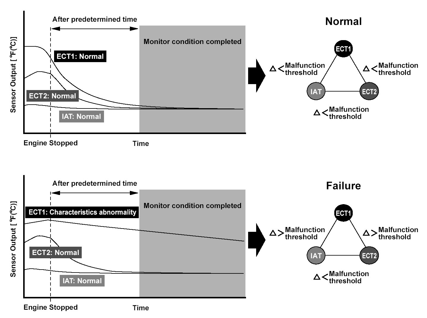When the engine is stopped and enough time has passed, the temperature of the engine will equal the ambient temperature. When an inappropriate temperature is detected after comparing the temperature readings of each sensor, a malfunction in the corresponding sensor is detected and a DTC is stored.