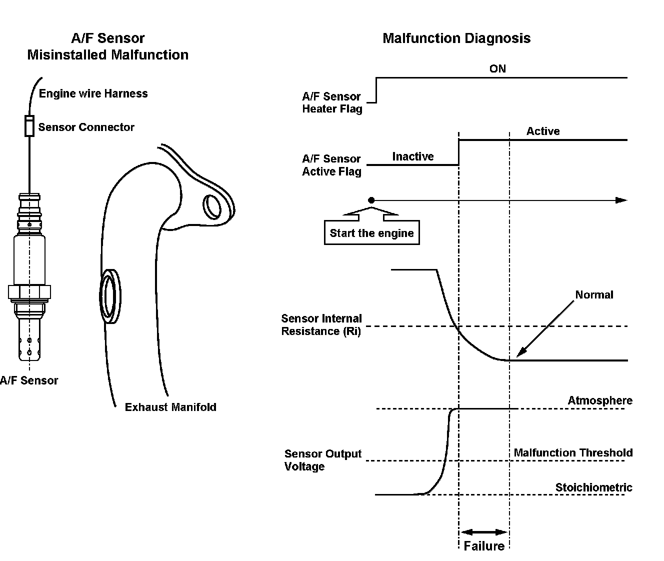 When the air/fuel ratio (A/F) sensor (sensor 1) is properly connected to the engine wire harness, but not installed in the exhaust pipe, the A/F feedback is not performed properly even if the A/F sensor is active after starting the engine. Thus, the exhaust emissions increase.