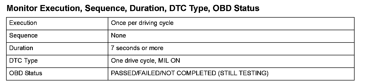 Monitor Execution, Sequence, Duration, DTC Type, OBD Status