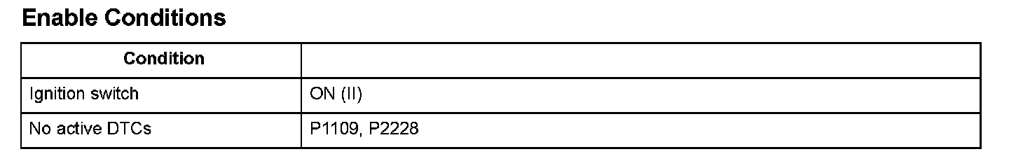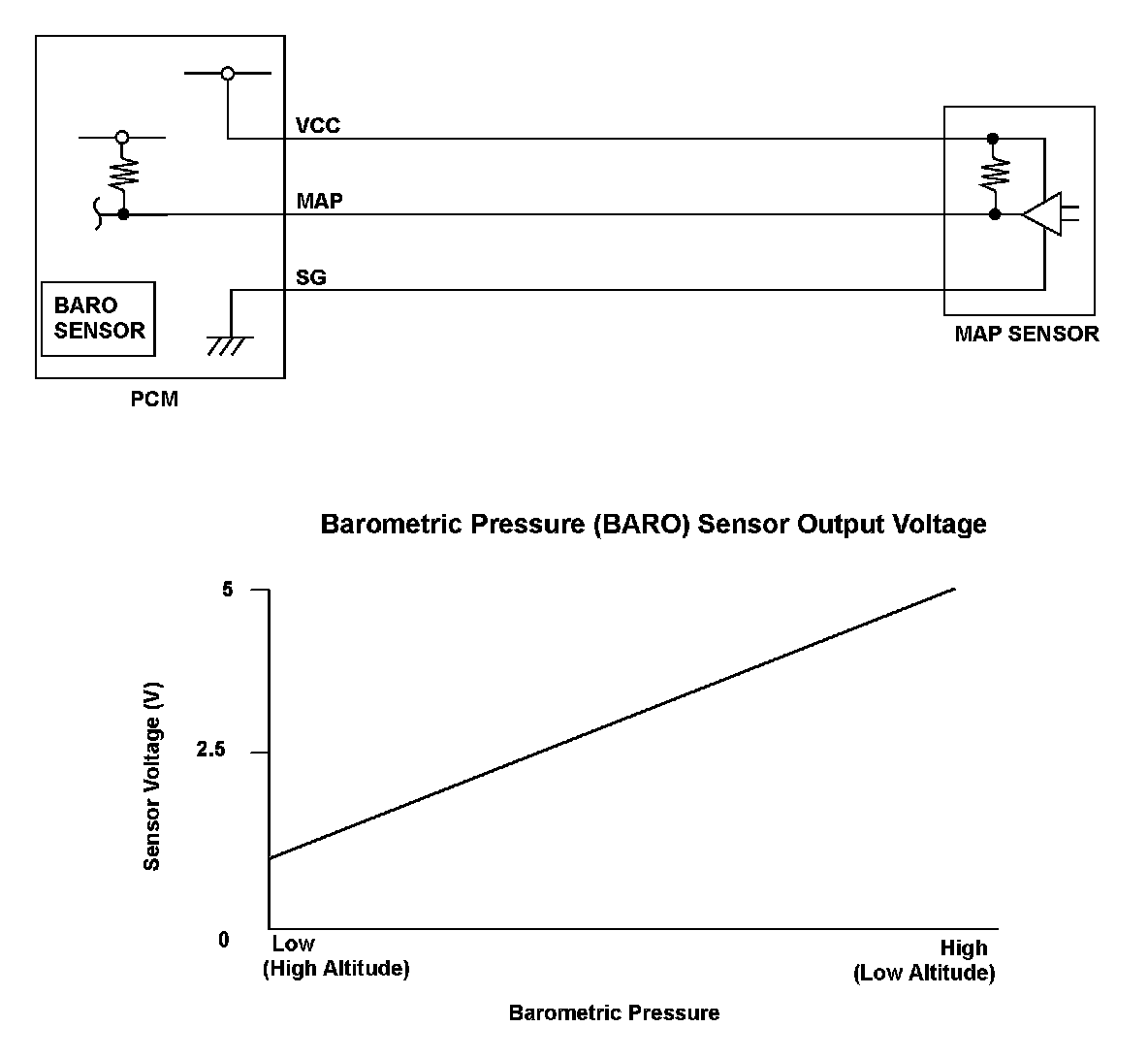 The barometric pressure (BARO) sensor is built into the powertrain control module (PCM) and monitors atmospheric pressure. The PCM estimates appropriate intake airflow from the manifold absolute pressure (MAP) sensor output voltage and BARO sensor output voltage. If the BARO sensor output voltage is a specified value or more, the PCM detects a malfunction and a DTC is stored.