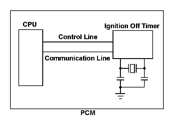 The powertrain control module (PCM) has a built-in ignition off timer that measures the time the ignition switch is in LOCK (0). This measurement is used for evaporative emission (EVAP) leak detection and temperature assumption of the catalytic converter. The CPU in the PCM accesses the ignition off timer when reading the measured time. If the access process fails, a malfunction is detected and a DTC is stored. When an abnormality is found in the read data, a malfunction is detected and a DTC is stored.