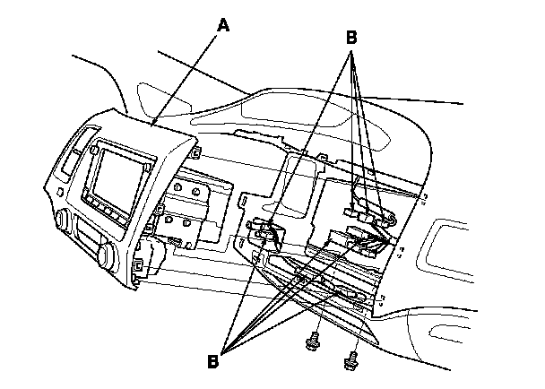 6. Remove the screws, brackets (A), and the navigation unit (B) from the center panel (C).