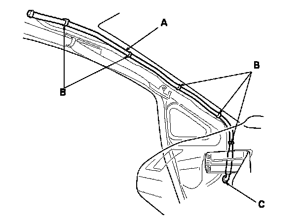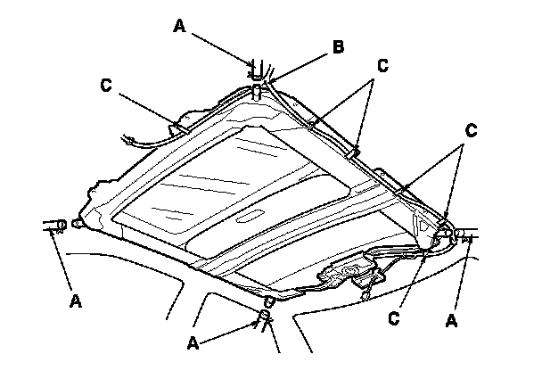 4. Remove the roof wire harness (B) by detaching the harness clips (C).