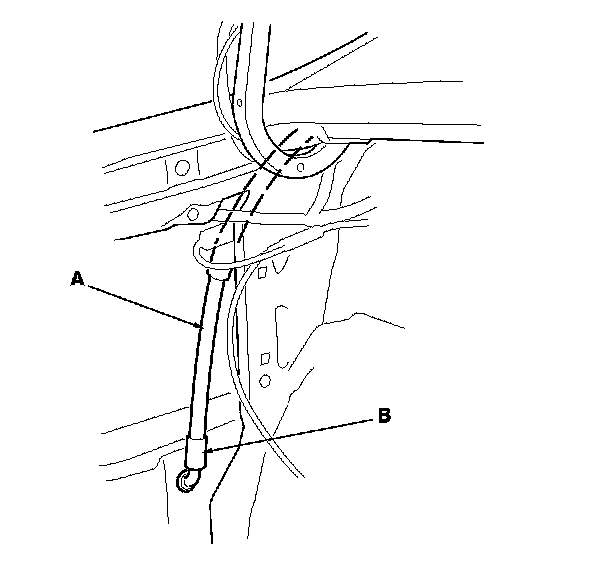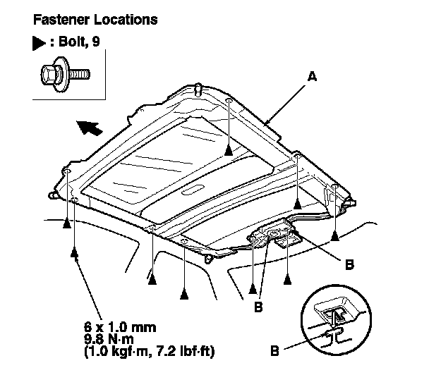 5. With an assistant holding the frame (A), remove the bolts, starting at the rear, and release the rear hooks (B) by moving the frame forward.
