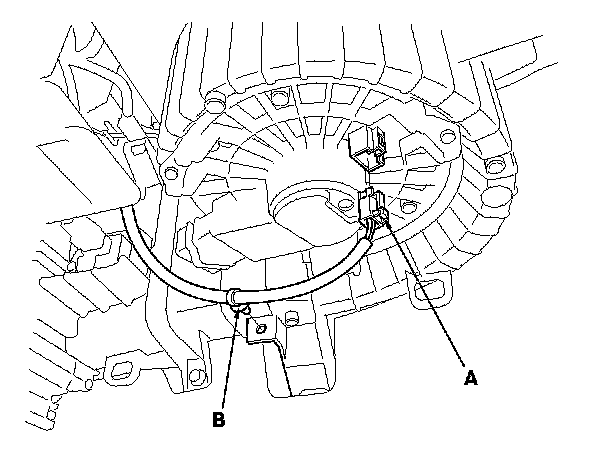 5. Disconnect the connector (A) from the blower motor. Remove the wire harness clip (B).