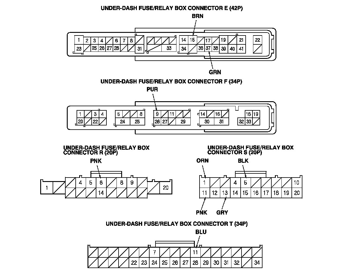 3. Disconnect the under-dash fuse/relay box connectors E, F, R, S, and T.