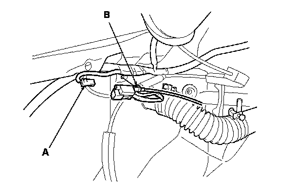 2. From the trunk compartment, disconnect the fuel fill door switch connector (A), and detach the harness clip (B).
