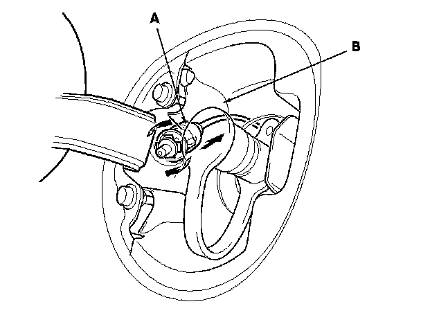 4. From the wheel arch, detach the clips, and remove the grommet (A), then pull the fuel fill door switch cable (B) out through the hole in the body. Take care not to kink the cable.