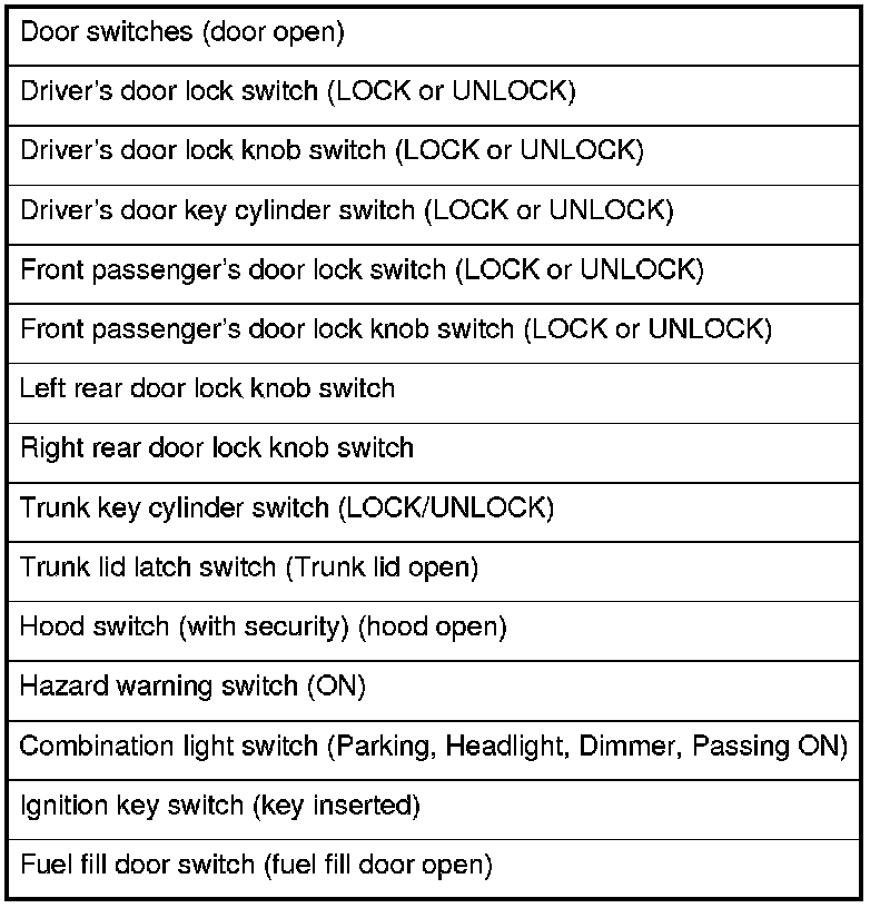 When the ignition switch is turned to ON (II), the MICU, gauge control module, immobilizer-keyless control unit-receiver, and PCM wake up at the same time without "talking" to each other through the communication lines. When any switch in the multiplex integrated control system is turned on, it wakes up its related control unit which, in turn, wakes up the other units. After confirming the sleep mode, look in the following table for the switch most related to the problem. Operate that switch and see if its control unit wakes up.