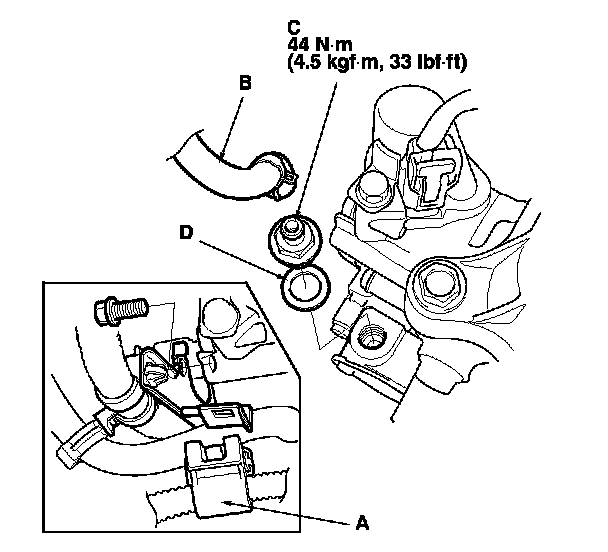 Install the parts in the reverse order of removal with a new washer (D).