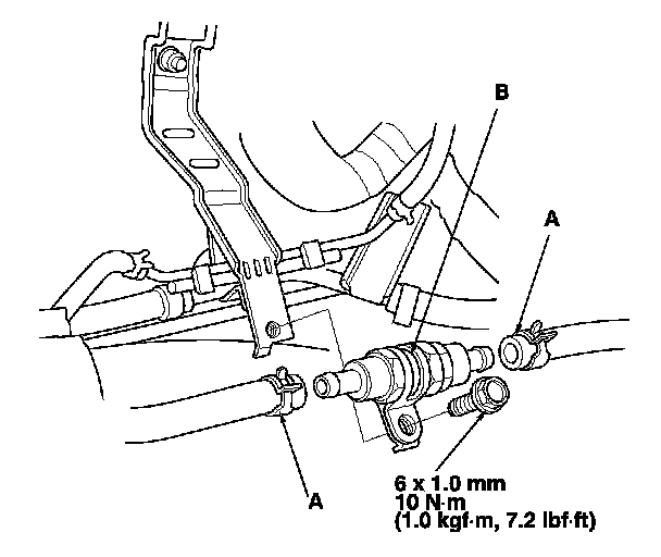 2. Disconnect the water bypass hoses (A) from the fuel pressure regulator thermostat, then plug the hoses.