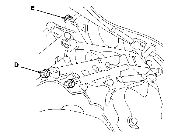 21. Connect the A/T oil pressure gauge to the 3rd clutch pressure inspection port (D) and the 4th clutch pressure inspection port (E).