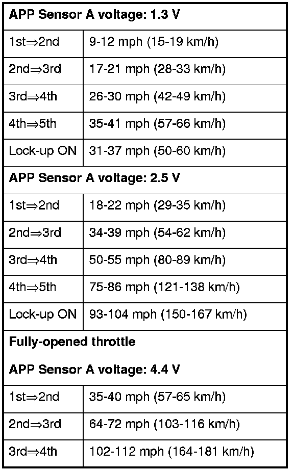 14. Review each snapshot individually and compare the Shift Control, APP Sensor A (V), and the Vehicle Speed to the table below.