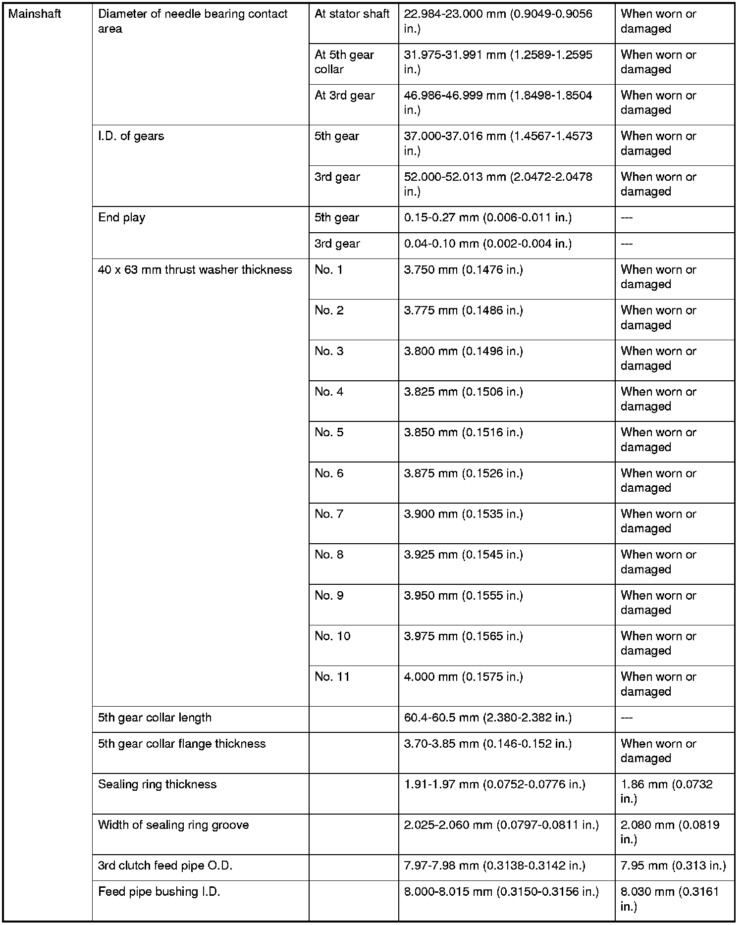 Mainshaft Specifications
