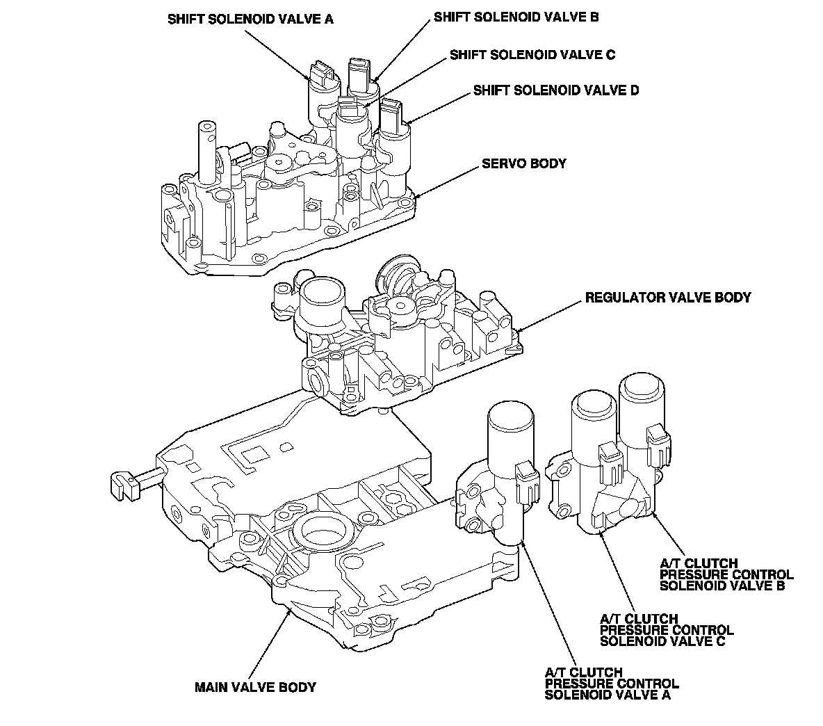 The valve body includes the main valve body, the regulator valve body, and the servo body. The ATF pump is driven by splines on the end of the torque converter which is attached to the engine. Fluid flows through the regulator valve to maintain specified pressure through the main valve body to the manual valve, directing pressure to each of the clutches. Shift solenoid valves A, B, C, and D are mounted on the servo body. A/T clutch pressure control solenoid valves A, B, and C are mounted on the transmission housing.