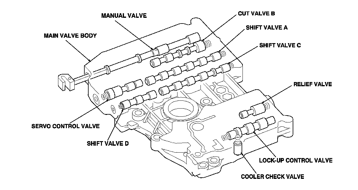 The main valve body contains the manual valve, cut valve B, shift valves A, C, and D, the relief valve, the lock-up control valve, the cooler check valve, the servo control valve, and the ATF pump gears. The primary function of the main valve body is to switch fluid pressure on and off to control hydraulic pressure going to the hydraulic control system.