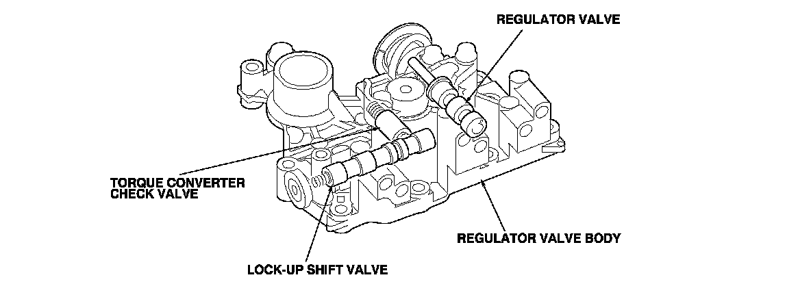 The regulator valve body is located on the main valve body. The regulator valve body contains the regulator valve, the torque converter check valve, the lock-up shift valve, the 1st accumulator, and the 3rd accumulator.