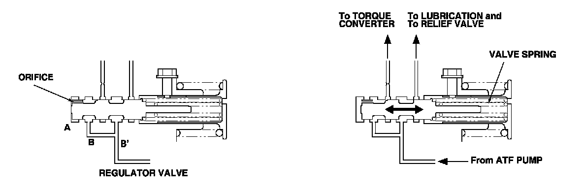 The regulator valve maintains constant hydraulic pressure from the ATF pump to the hydraulic control system, while also providing fluid to the lubrication system and the torque converter. Fluid from the ATF pump flows through B and B'. Fluid entering from B flows through the valve orifice to the A cavity. This pressure in the A cavity pushes the regulator valve toward the spring, and this movement of the regulator valve uncovers the fluid port to the torque converter and the relief valve. The fluid flows out to the torque converter and the relief valve, and the regulator valve returns under spring force. According to the level of the hydraulic pressure through B, the position of the regulator valve changes, and the amount of fluid from B' through the torque converter also changes. This operation is continuous, maintaining the line pressure.
