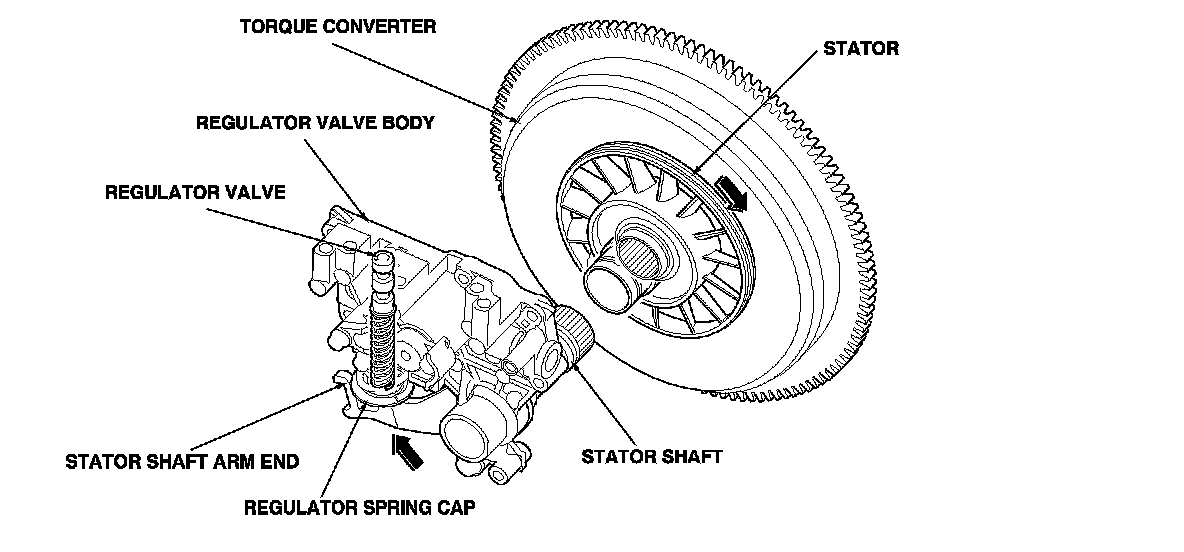 Increases in hydraulic pressure according to torque are regulated by the regulator valve using stator torque reaction. The stator shaft is splined with the stator in the torque converter, and its arm end contacts the regulator spring cap. When the vehicle is accelerating or climbing (torque converter range), stator torque reaction acts on the stator shaft, and the stator arm pushes the regulator spring cap in the direction of the arrow in proportion to the reaction. The stator reaction spring compresses, and the regulator valve moves to increase the line pressure which is regulated by the regulator valve. The line pressure reaches its maximum when the stator torque reaction reaches its maximum.