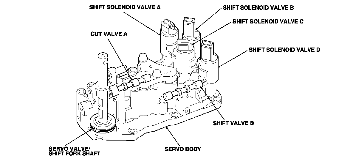 The servo body is located on the main valve body. The servo body contains the servo valve, shift valve B, cut valve A, the accumulators for 2nd, 4th, and 5th, and shift solenoid valves A, B, C, and D.