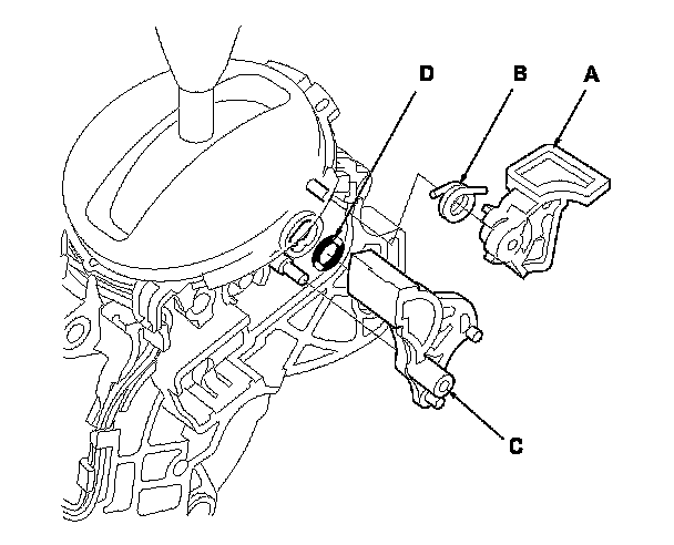 4. Remove the shift lock stop (C) and the stop cushion (D), and replace the shift lock stop or the stop cushion.