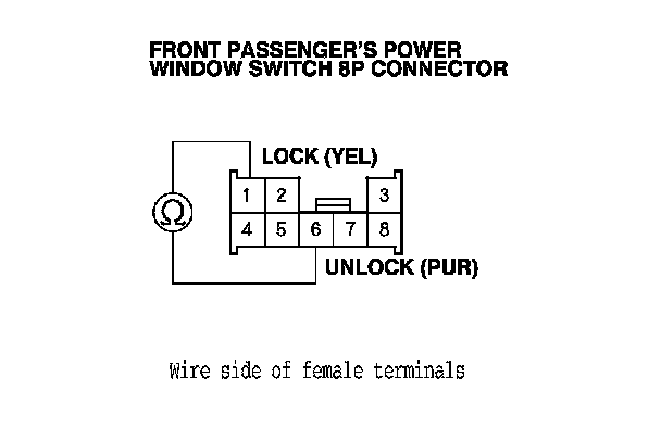 15. Check for continuity between front passenger's power window switch 8P connector terminals No. 1 (LOCK) and No. 6 (UNLOCK).
