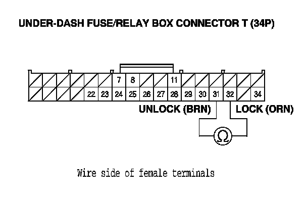 11. Check for continuity between under-dash fuse/relay box connector T (34P) terminals No. 31 (UNLOCK) and No. 32 (LOCK) and body ground.